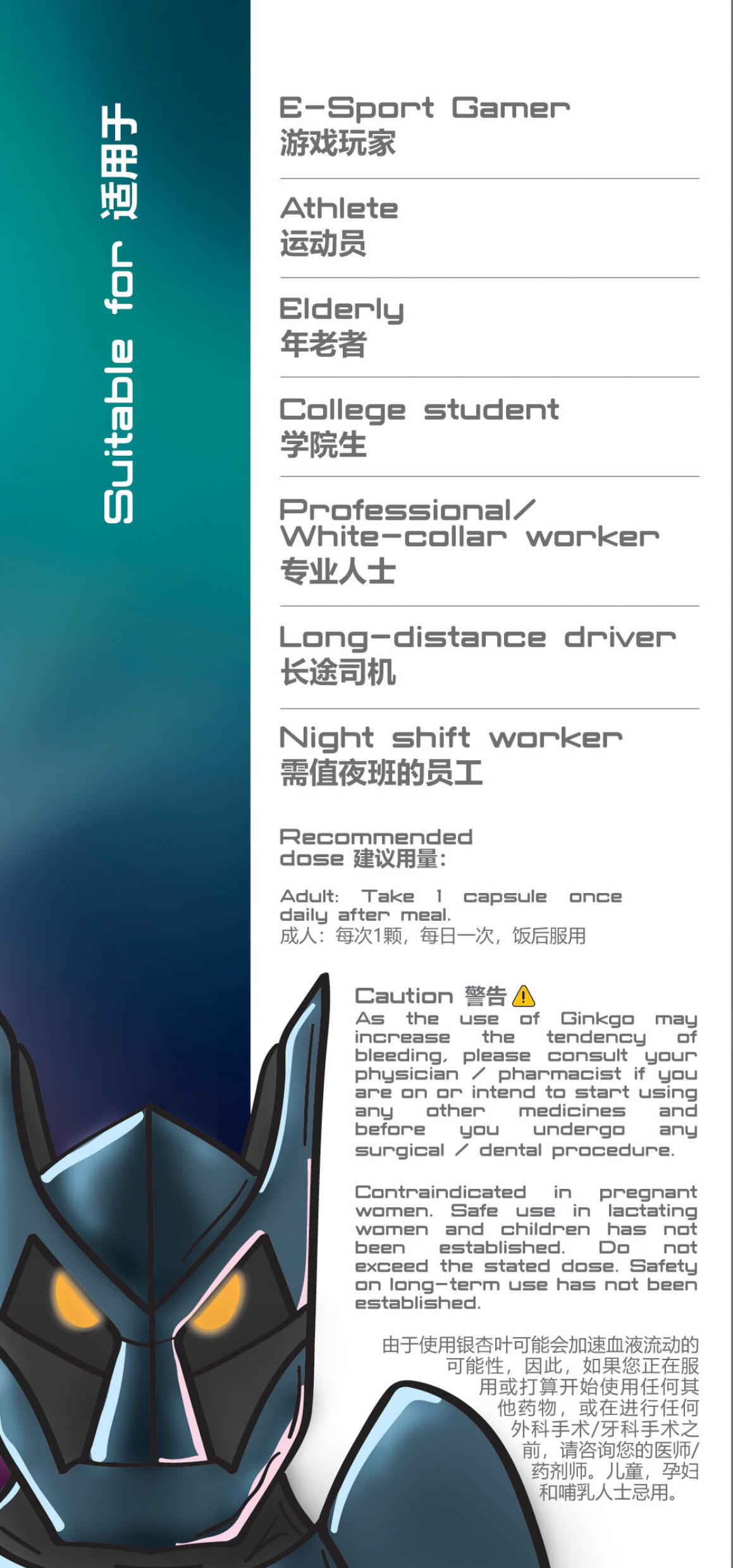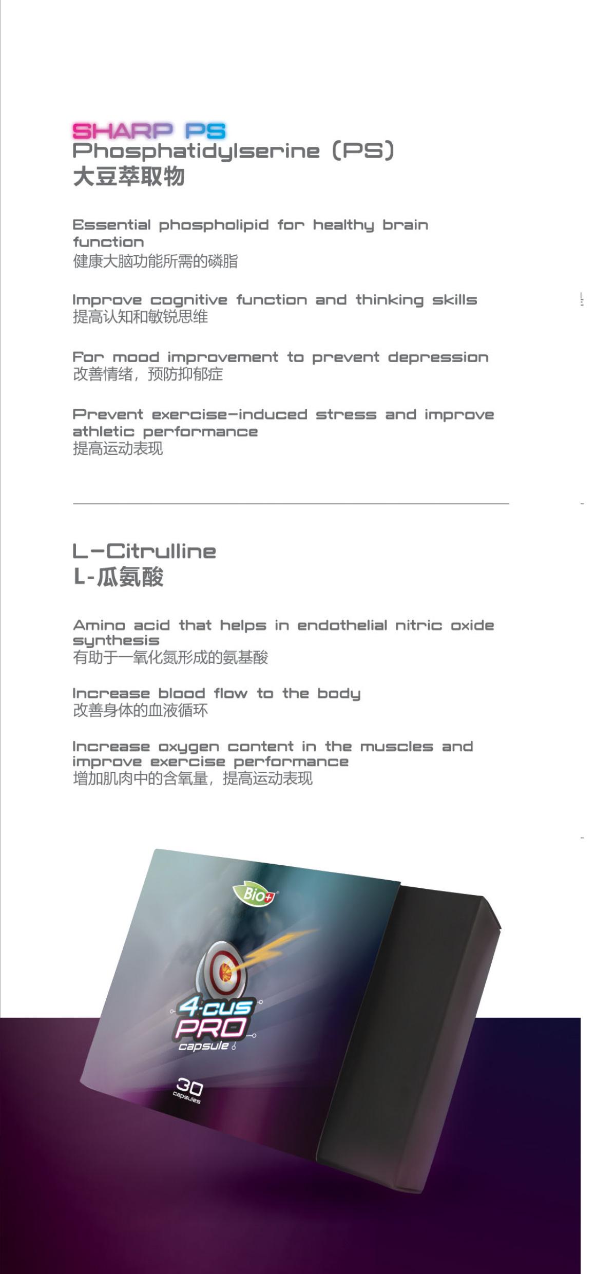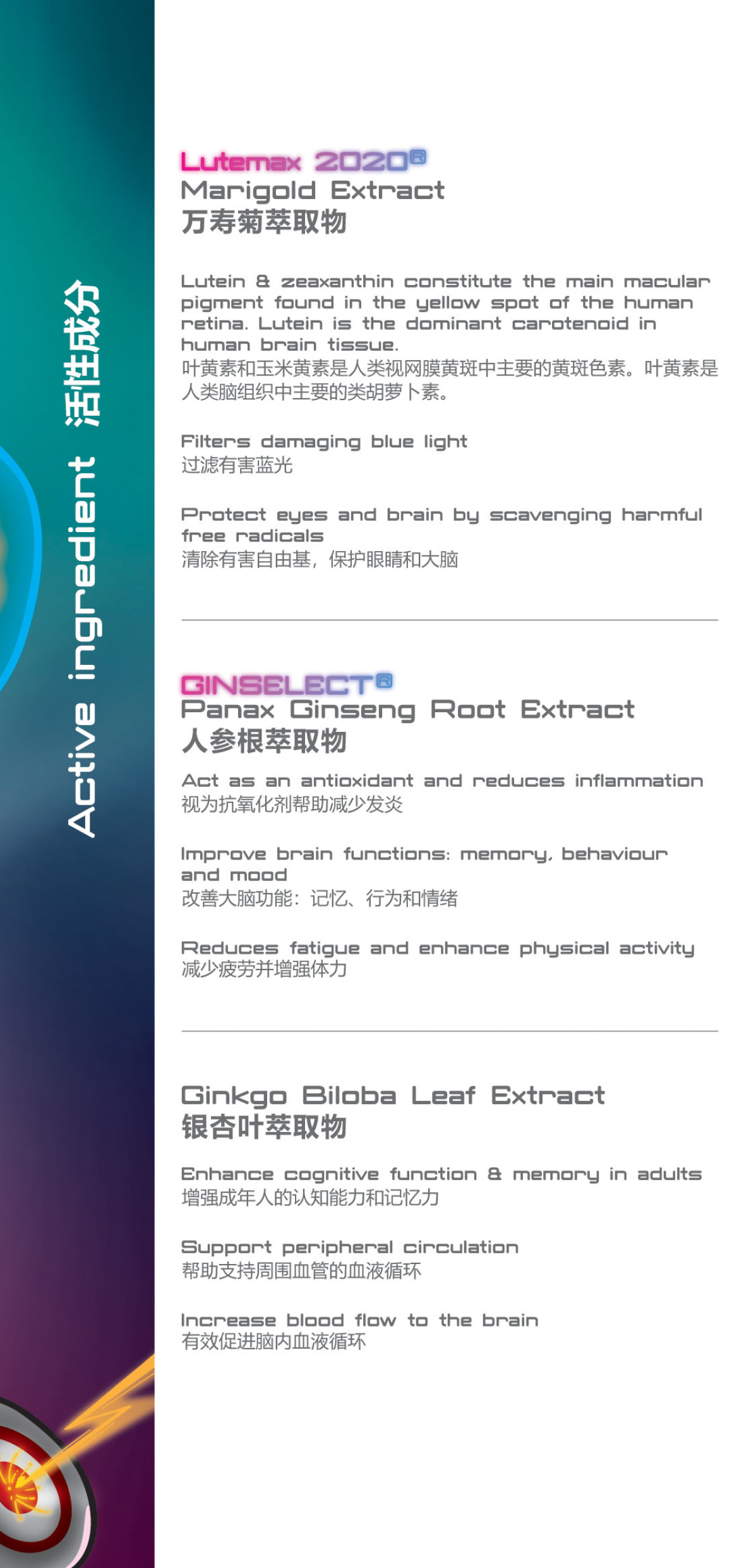 - 3 patented ingredients with clinical studies: Panax ginseng root extract (Ginselect®, Italy), Marigold flower extract (Lutemax 2020®, India), Phosphatodylserine (Sharp-PS®, USA)