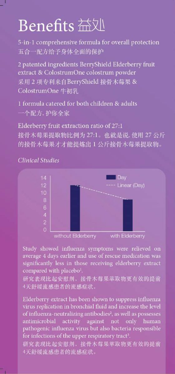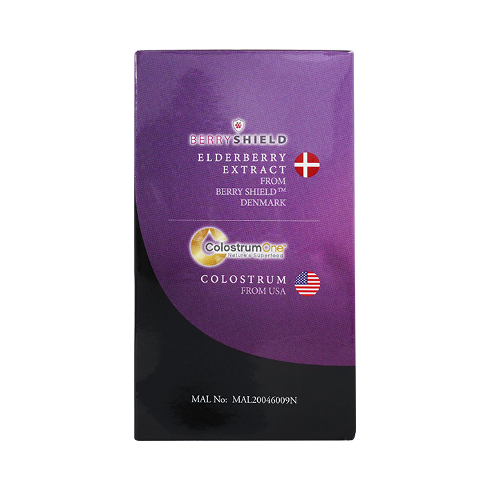 - Patented elderberry fruit extract (27:1 extraction ratio) from BerryShield, Denmark