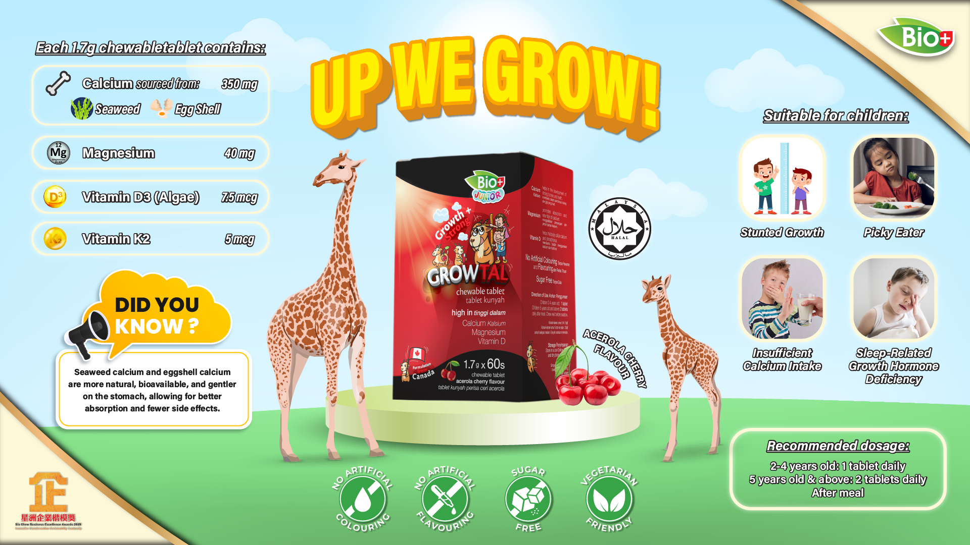 Bio+ Junior GrowTal addresses the nutritional gap highlighted in local studies and adheres to the Recommended Nutrient Intake (RNI) for Malaysian children aged 1–9: