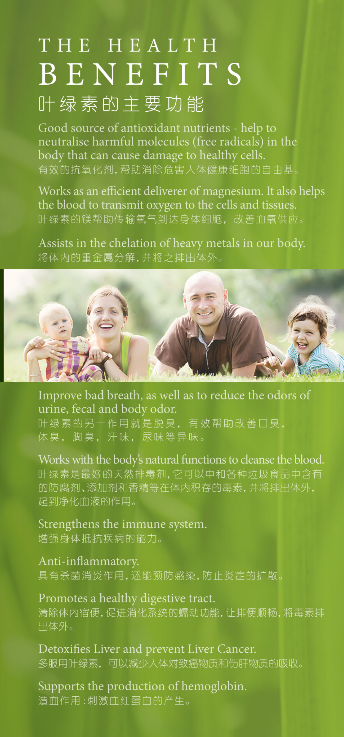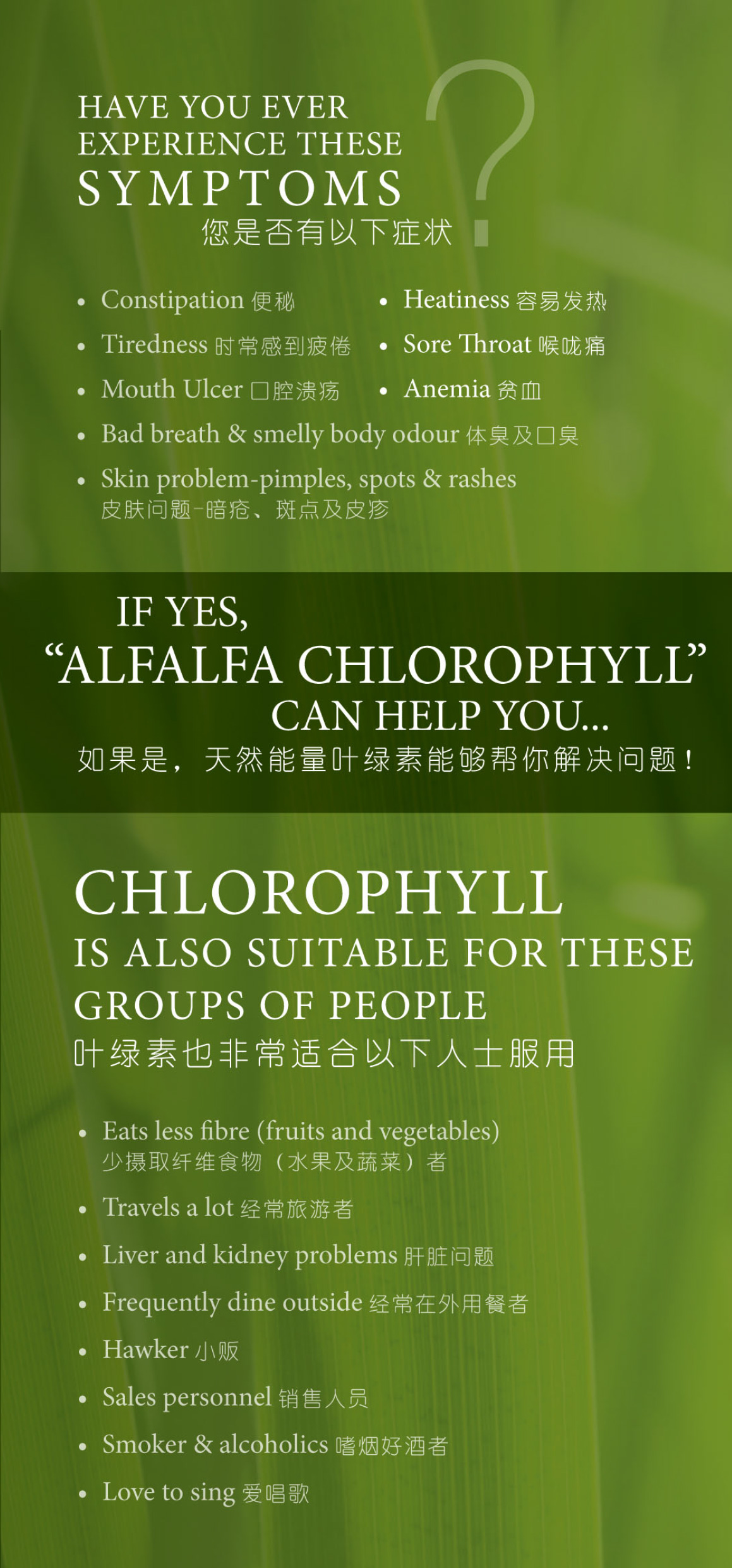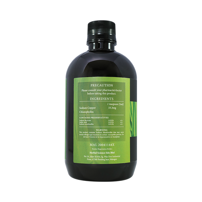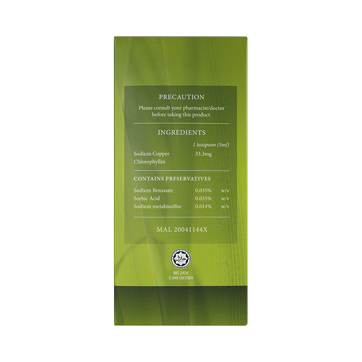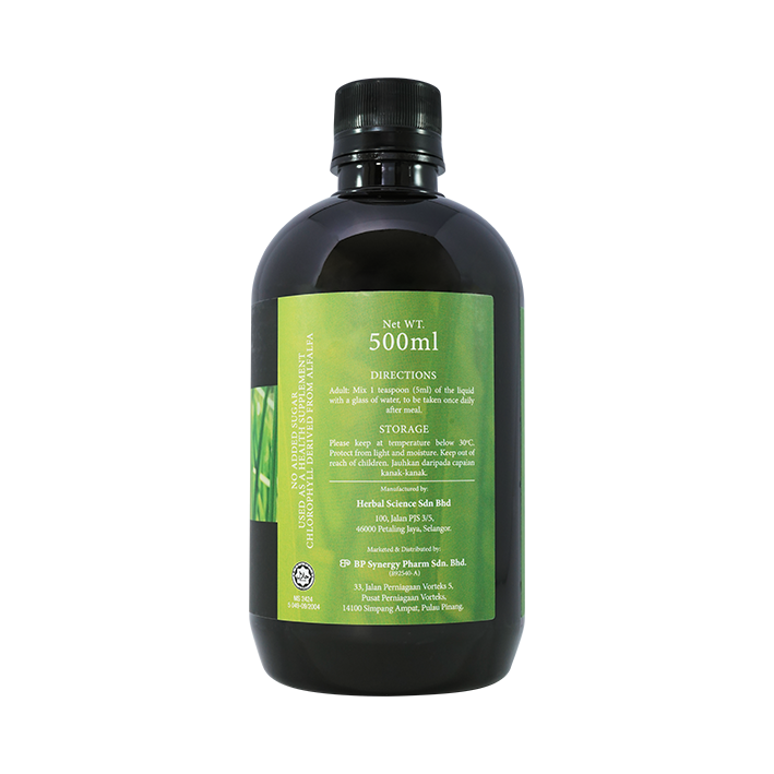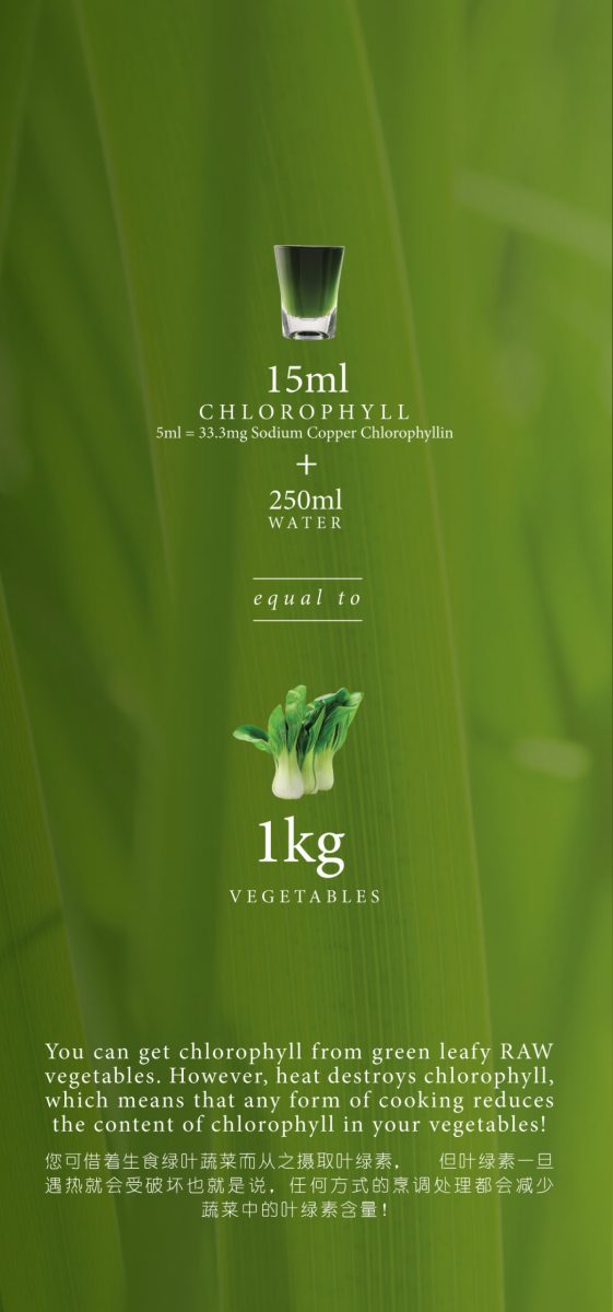 Alfalfa derived chlorophyll - 15ml chlorophyll + 250ml water = 1kg vegetables