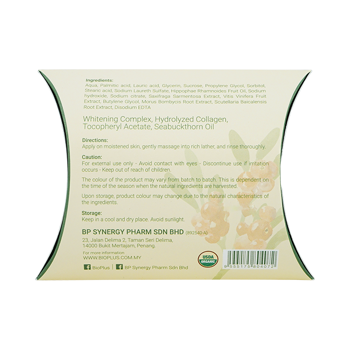 Aqua, Palmitic acid, Lauric acid, Glycerin, Sucrose, Propylene Glycol, Sorbitol, Stearic acid, Sodium Laureth Sulfate, Hippophae Rhamnoides Fruit Oil, Sodium hydroxide, Sodium citrate, Saxifraga Sarmentosa Extract, Vitis Vinifera Fruit Extract, Butylene Glycol, Morus Bombycis Root Extract, Scutellaria Baicalensis Root Extract, Disodium EDTA