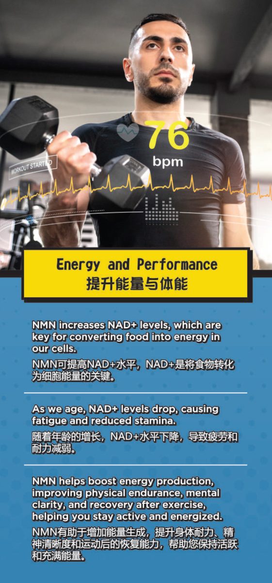 NMN helps boost energy production, improving physical endurance, mental clarity, and recovery after exercise, helping you stay active and energized.