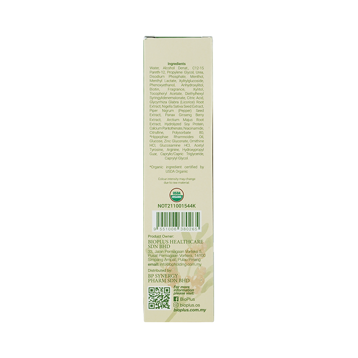 Water, Alcohol Denat, C12-15 Pareth-12, Propylene Glycol, Urea, Disodium Phosphate, Menthol, Menthyl Lactate, Xylitylglucoside, Phenoxyethanol, Anhydroxylitol, Biotin, Fragrance, Xylitol, Tocopheryl Acetate, Diethylhexyl Syringylidenemalonate, Citric Acid, Glycyrrhiza Glabra (Licorice) Root Extract, Nigella Sativa Seed Extract, Piper Nigrum (Pepper) Seed Extract, Panax Ginseng Berry Extract, Arctium Majus Root Extract, Hydrolyzed Soy Protein, Calcium Panthothenate, Niacinamide, Citrulline, Polysorbate 80, *Hippophae Rhamnoides Oil, Glucose, Zinc Gluconate, Ornithine HCI, Glucosamine HCI, Acetyl Tyrosine, Arginine, Hydroxypropyl Guar, Caprylic/Capric Triglyceride, Caprylyl Glycol.