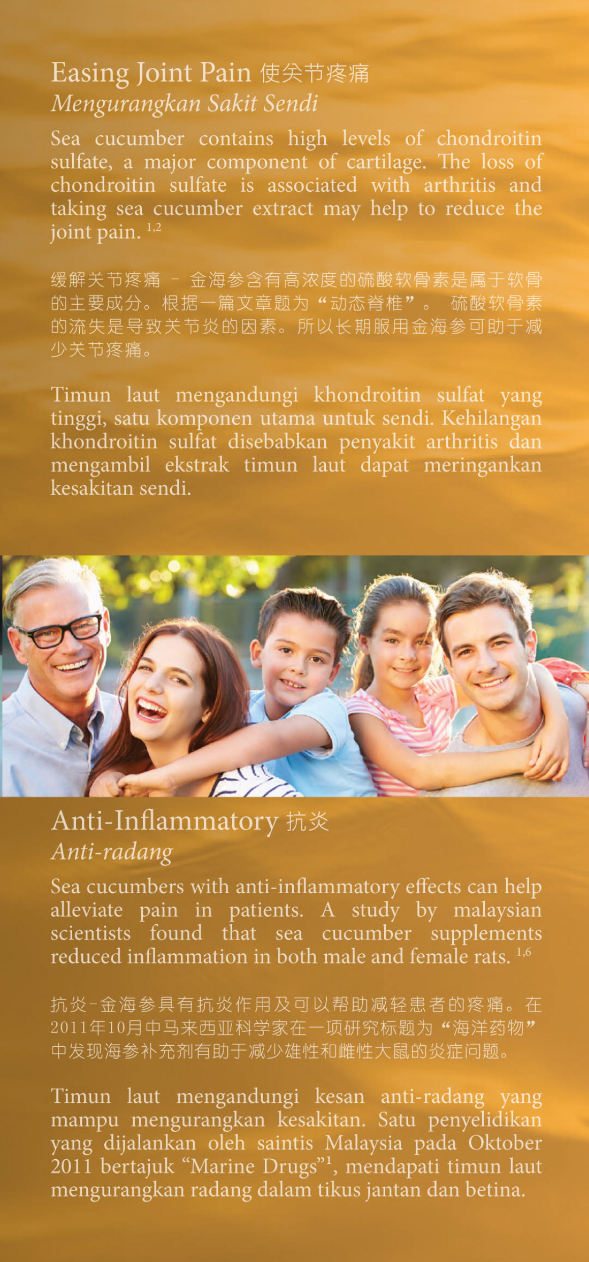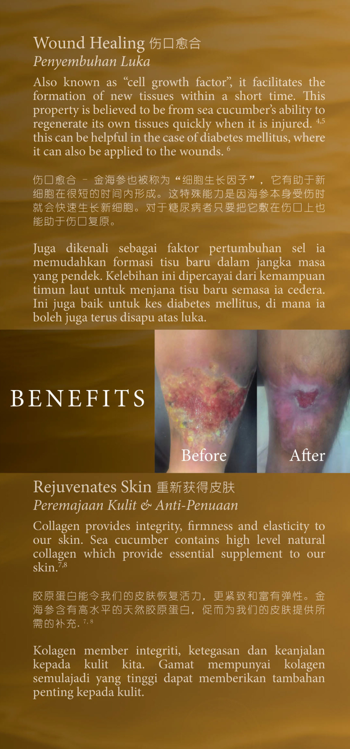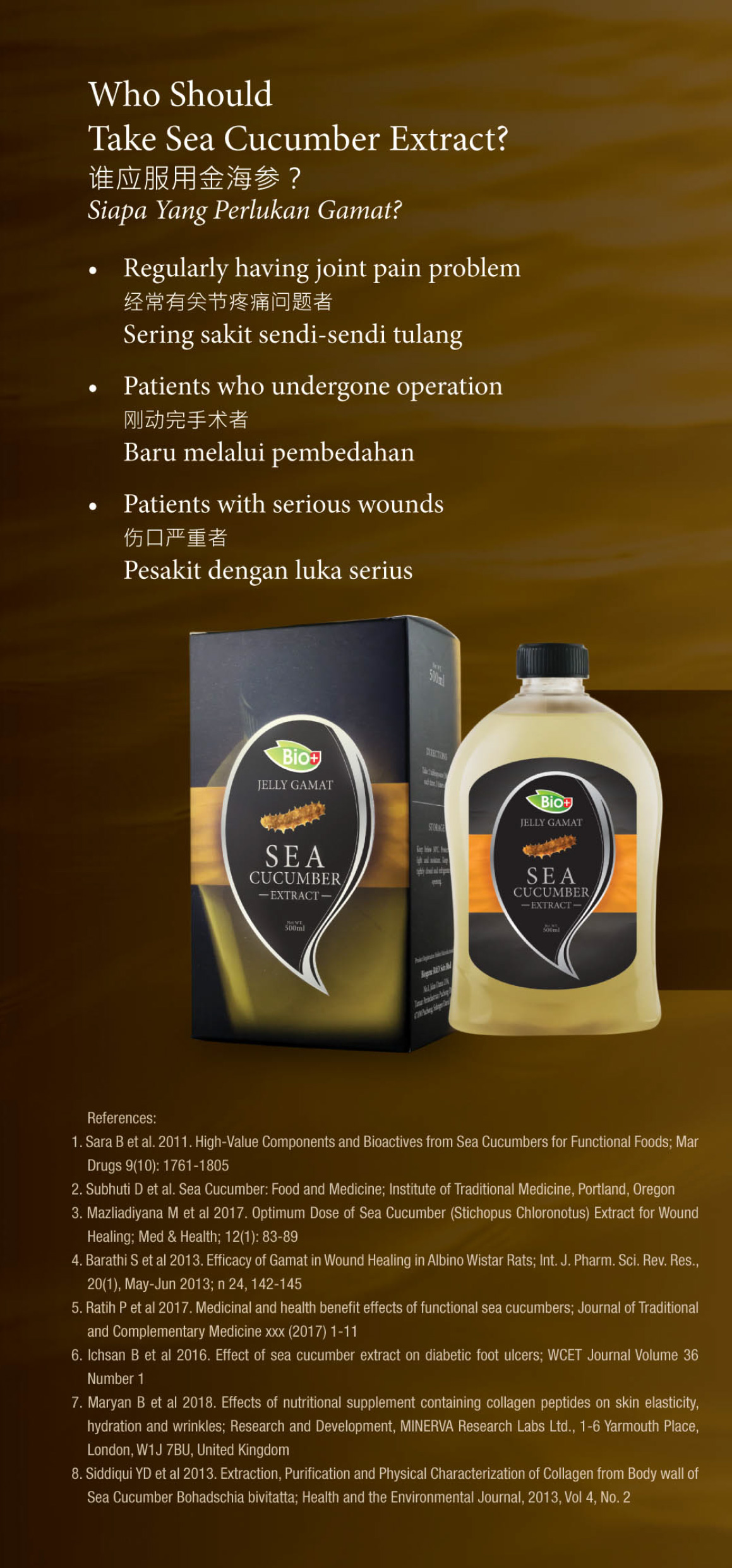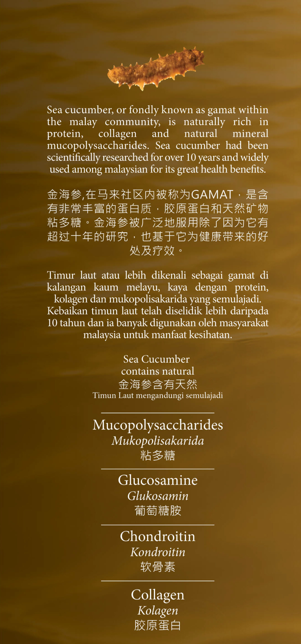 Sea cucumber, or fondly known as gamat within the Malay community, is naturally rich in protein, collagen and natural mineral mucopolysaccharides. Sea cucumber had been scientifically researched for over 10 years and widely used among Malaysian for its great health benefits.